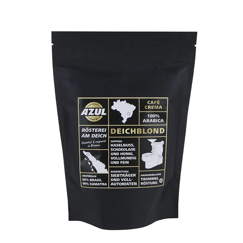 Die Deichblond Mischung der Azul Rösterei besteht zu 60% aus brasilianischen Arabicas und zu 40% aus Arabicas aus Sumatra. Die hell gerösteten Bohnen des Signature Blends der Rösterei am Deich verleihen dem ausgewogenen Ergebnis in der Tasse viel Körper und eine feine Eleganz. Begleitet wird dieses Geschmackserlebnis von Noten nach Haselnuss und Schokolade mit Anklängen von Honigsüße.