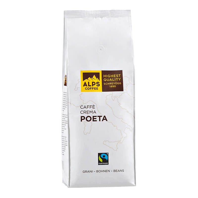 Die Kaffeerösterei Alps Coffee Schreyögg blickt auf eine lange Familientradition und kreiert seit 1890 feinste Kaffeequalität. Der Caffee Crema Poeta von Schreyögg mit Bohnen aus fair zertifiziertem Anbau wurde schonend im Trommelverfahren geröstet. Diese schonende Röstung führt dazu, dass sich die Aromen optimal entfalten können. Nachhaltigkeit und Qualität treffen bei diesem Produkt aufeinander und bereiten ein intensives Geschmackserlebnis.